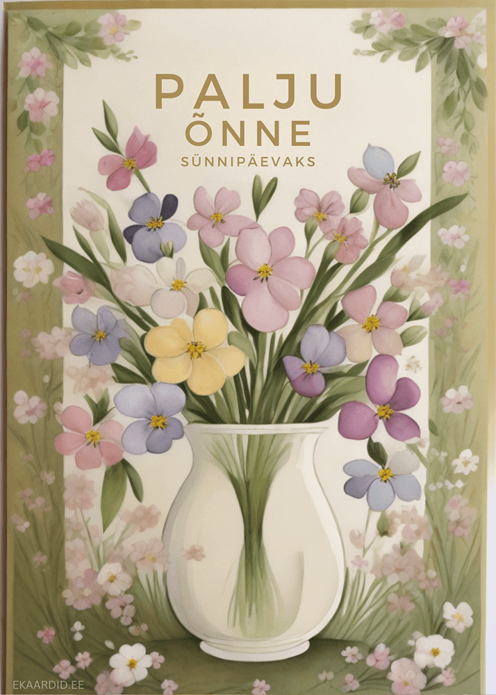 See on ideaalne Sünnipäevakaart, mis on kaunistatud pastelsetes toonides lilledega vaasis. Õrn ja elegantne disain sobib igaühele.