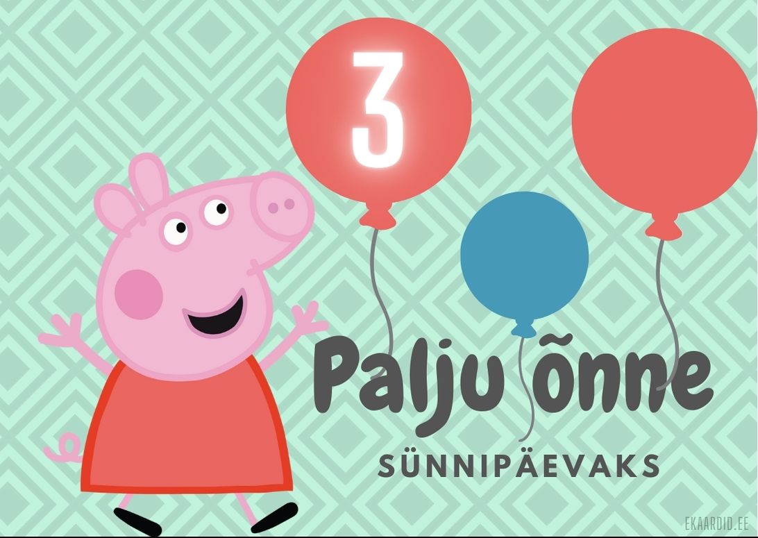 See on armas sünnipäevakaart Peppa Seaga ja värviliste õhupallidega. Ideaalne kolmanda sünnipäeva tähistamiseks!