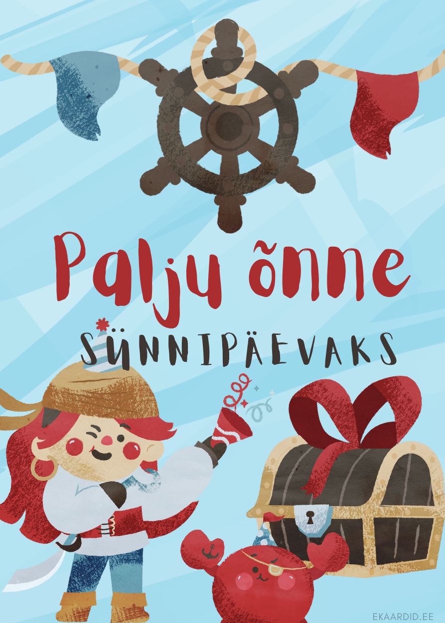 See on vahva mereteemaline sünnipäevakaart, mis sobib suurepäraselt poisile, kellele meeldivad piraadid ja mereelu. Kaardil on kujutatud piraat, aarete kirst ja rool.
