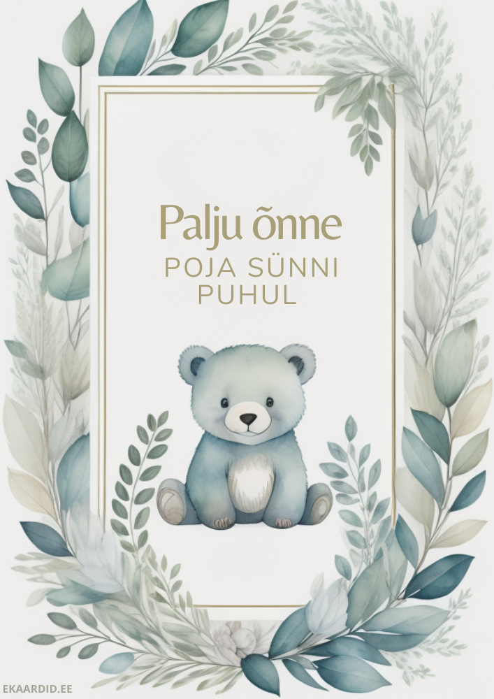 Õrn ja armas sünnipäevakaart poja sünni puhul. Kaardil on armas karu ja roheliste toonidega taimestik. See on ideaalne tahtpäevad-synd kaart.