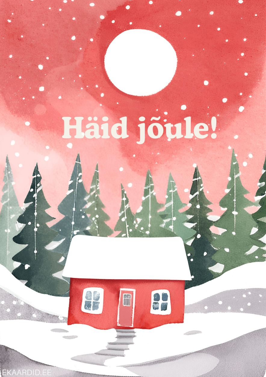 Soojad jõulutervitused lumises maastikus asuva punase talumajaga jõulukaardil. See on ideaalne jõulukaart lähedastele.