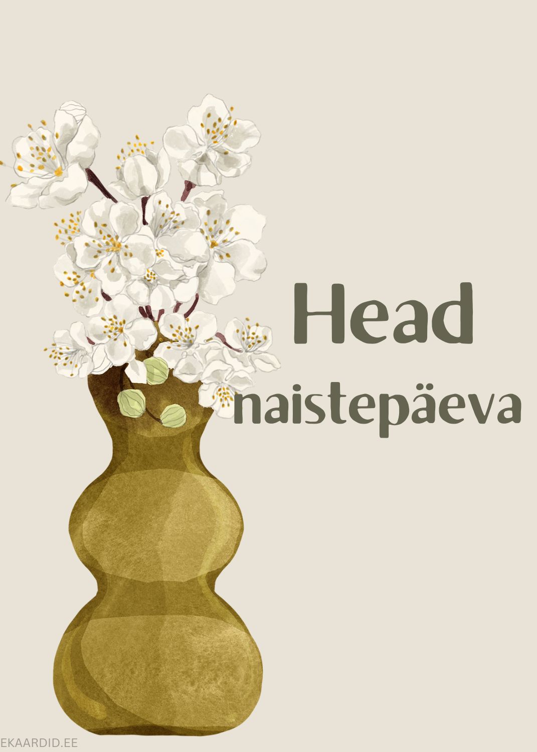 Soovi oma kallimale naistepäeva puhul palju õnne selle õrna ja elegantse kaardiga. Kaardil on kujutatud valged õied oliivrohelises vaasis. See on ideaalne naistepäevakaart.