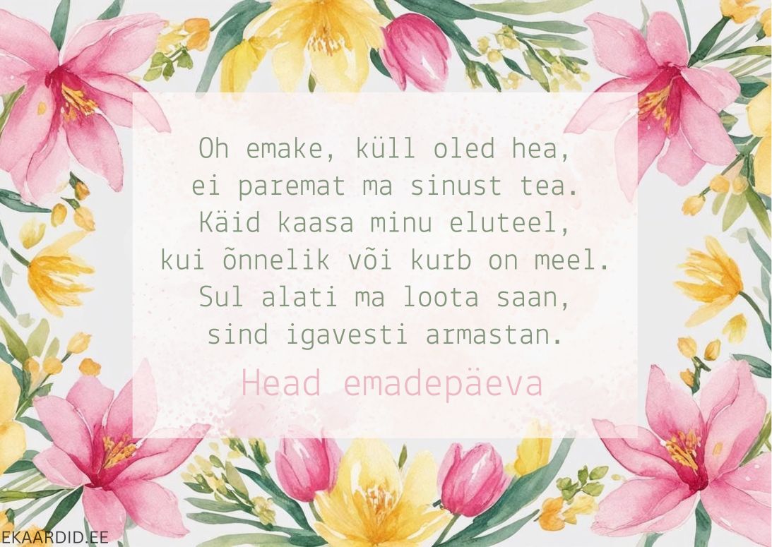 Soovi oma emale ilusat emadepäeva selle õrnade lilledega kaardiga. Kaunis kujundus ja südamlik sõnum teevad sellest ideaalse kingituse.