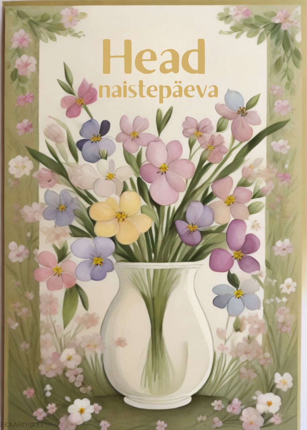 Soovi naistele ilusat naistepäeva selle õrnade lilledega kaardiga. See on ideaalne naistepäevakaart, mis väljendab hellust ja lugupidamist.