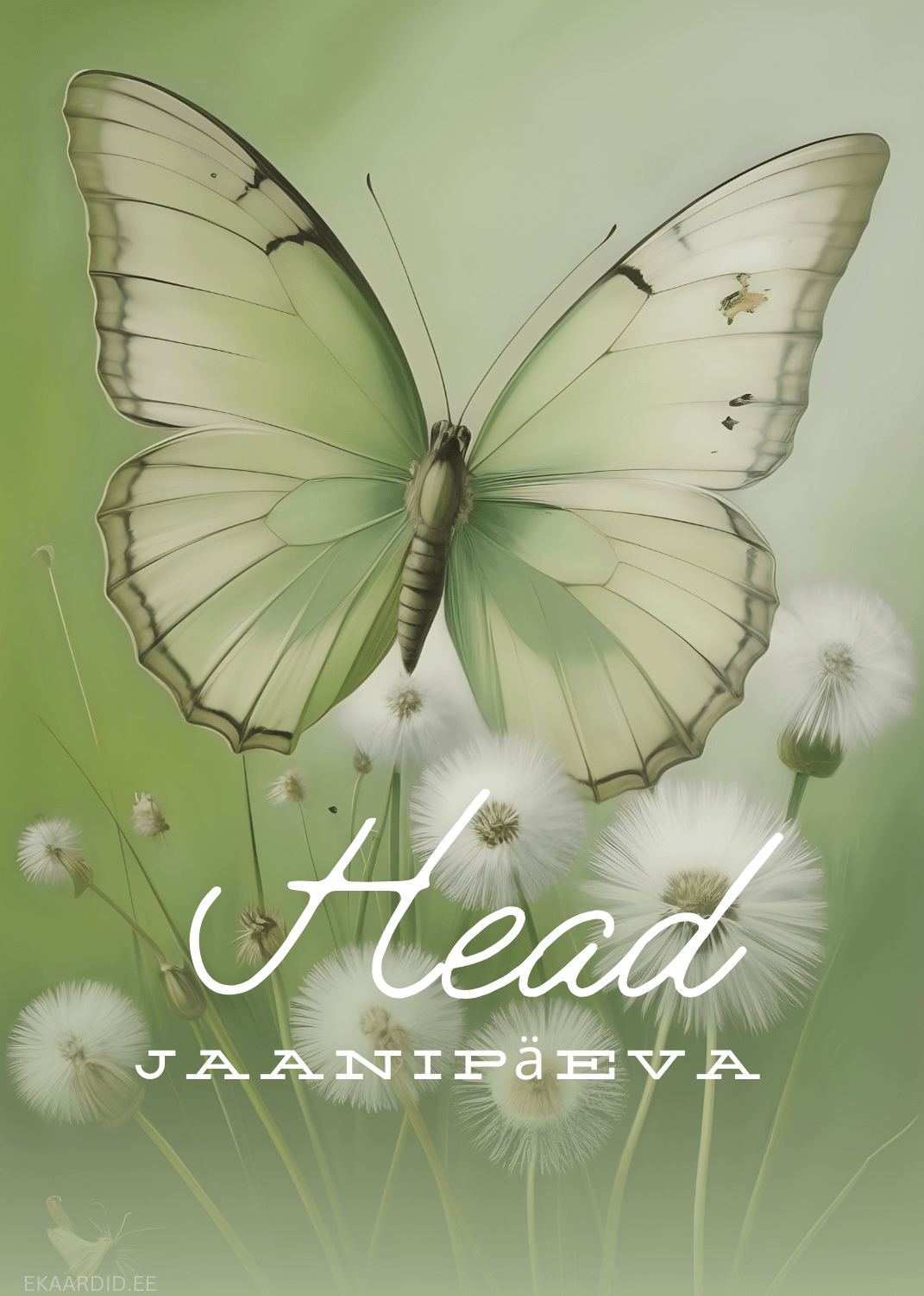 Soovi oma lähedastele ilusat Jaanipäeva selle rahuliku ja looduslähedase kaardiga. Kaardil on kujutatud roheline liblikas ja õrnad võililled. See on ideaalne Jaanipäeva kaart.