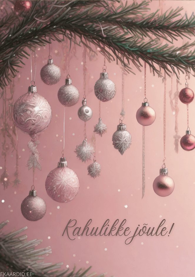 Sooja ja pidulikku jõulutunnet edastav kaart, millel on kujutatud roosad ja hõbedased jõulukuulid. See on ideaalne jõulukaart lähedastele ja sõpradele.
