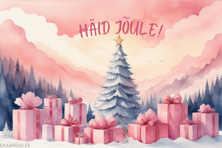 Sooja tooniga jõulukaardil on kujutatud roosad kingitused ja lumikatteline kuusk. See on ideaalne jõulukaart lähedastele.