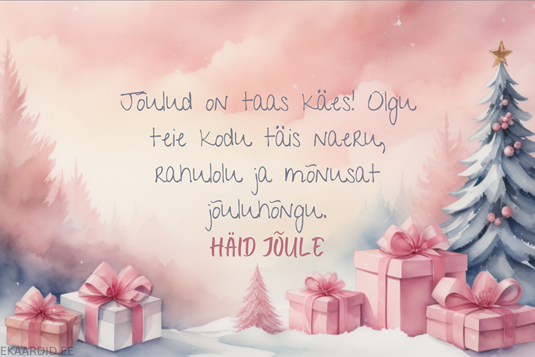 Soovi oma lähedastele rõõmsaid jõule selle kauni roosade kingitustega jõulukaardiga. See on ideaalne tahtpaevad-joulud kaart, mis toob sooja ja rahulolu.