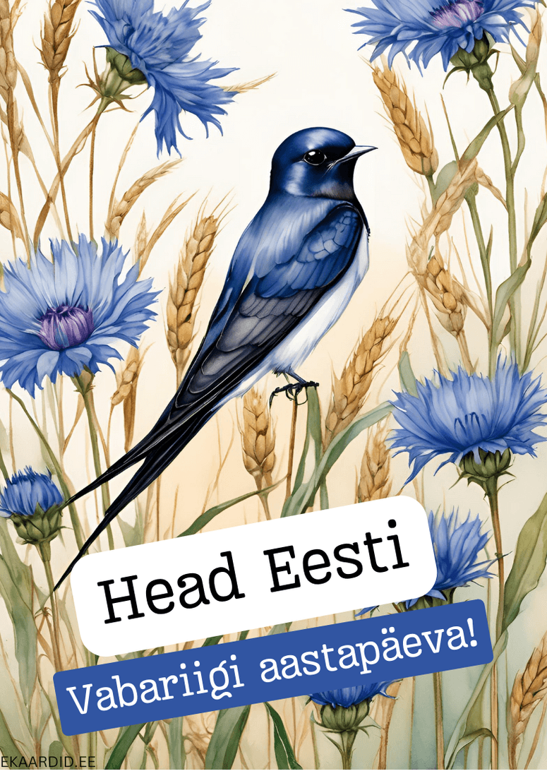 Soovi Eestile õnne selle kauni kaardiga, millel on kujutatud sinine lind ja karikakrad. Ideaalne kaart Eesti Vabariigi aastapäeva puhul.
