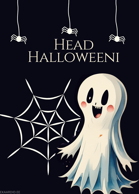 See on armas Halloweeni kaart, millel on kujutatud rõõmsameelne kummitus ja ämblikud. Ideaalne kaart Halloweeni puhul sõpradele ja perele.