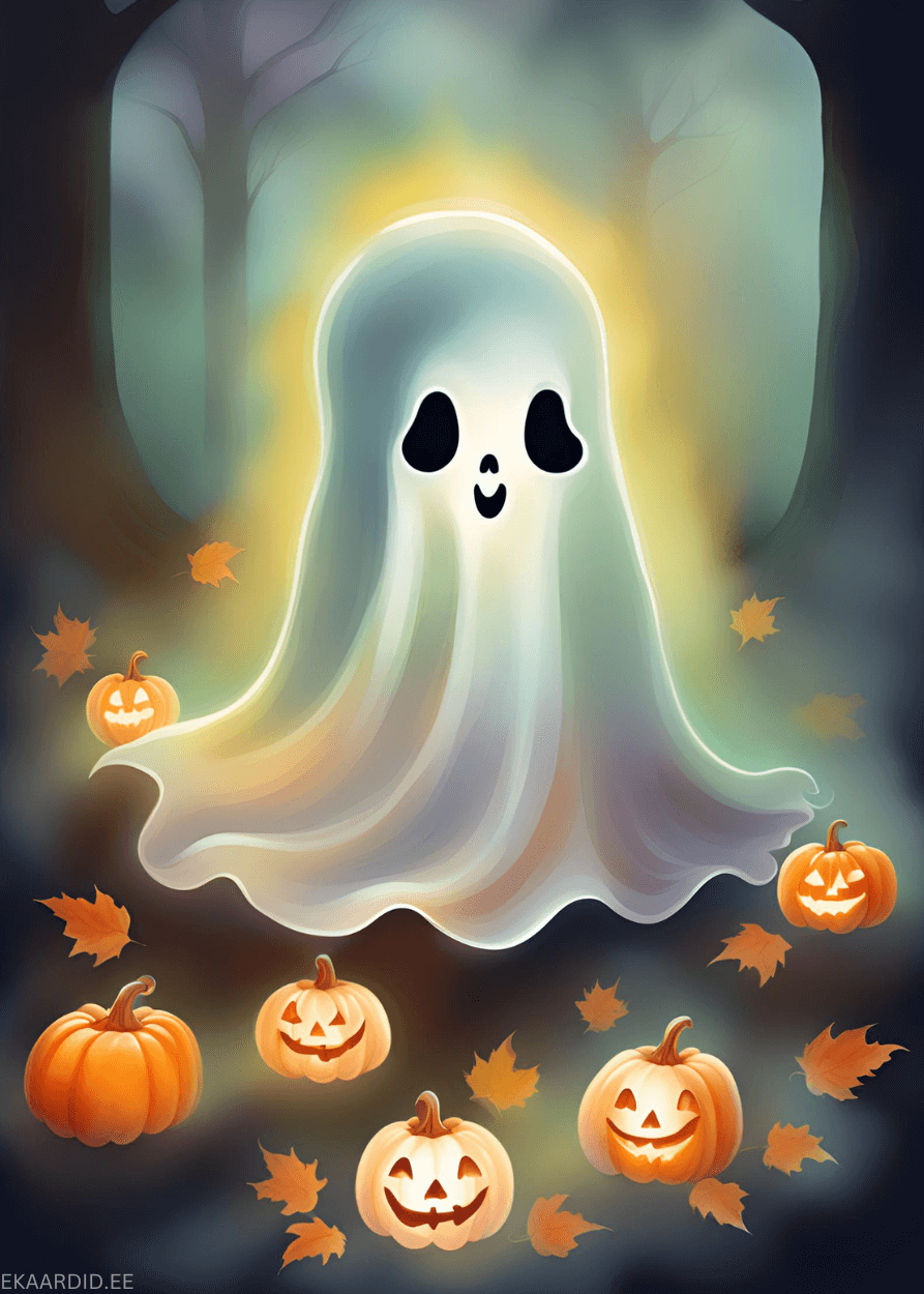 See on armas Halloweeni kaart, millel on sõbralik kummitus ja valgustatud kõrvitsad. Ideaalne Halloweeni tervituseks.