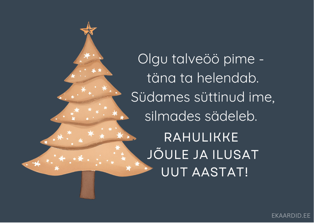 See on soe ja hubane jõulukaardid, mis sobib ideaalselt jõulude soovide saatmiseks lähedastele. Kaardil on kujutatud armas beež toonides jõulupuu, mis on kaunistatud väikeste tähtedega. Soovin teile rahulikke jõule ja ilusat uut aastat!