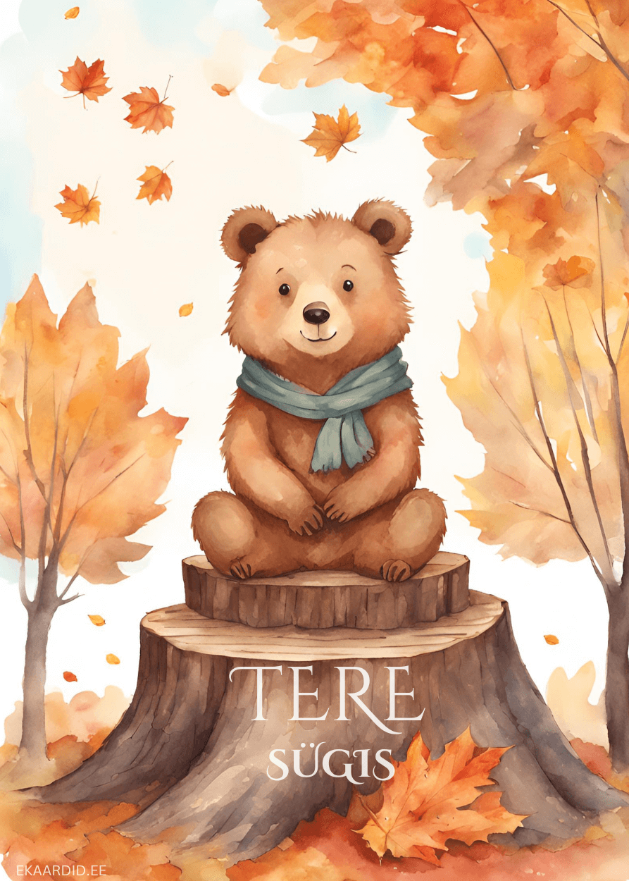 Sooja ja sügisest meeleoluga kaart, millel armas karu istub puutüvel. Ideaalne sügisese tervituse saatmiseks.