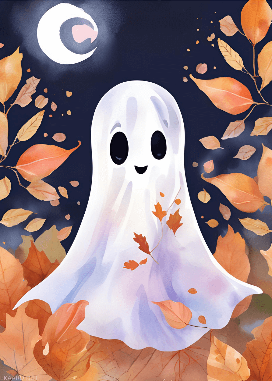 See on armas sügisene kaart, millel on kujutatud sõbralik kummitus sügislehtede seas. Ideaalne Halloweeni või sügiseteemaliseks tervituseks.