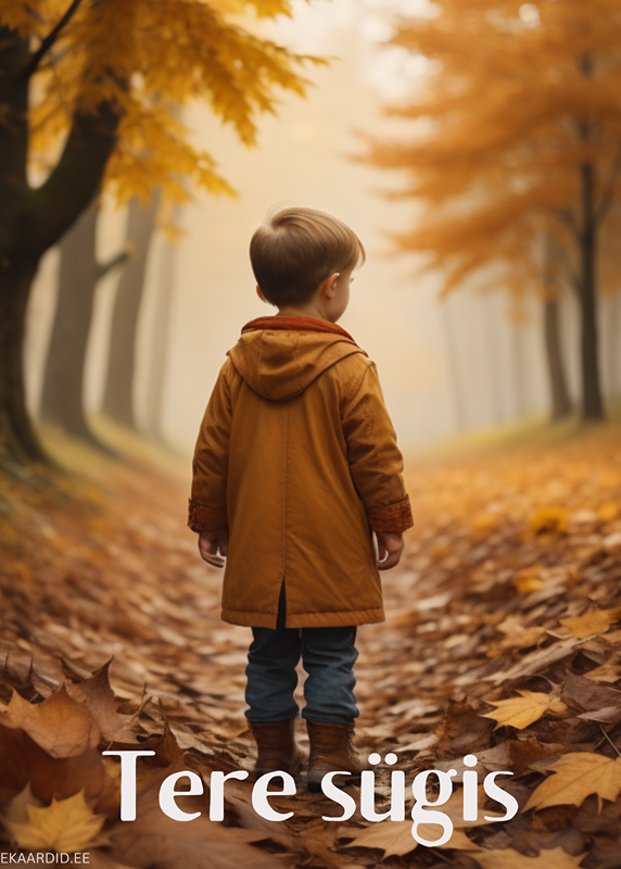 See armas sügisene kaart sobib suurepäraselt sügisese tervituse saatmiseks. Kaardil on kujutatud laps sügismetsas.