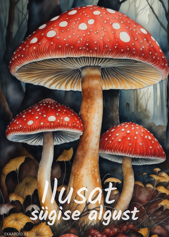 See on ilus sügisene kaart, millel on kujutatud punaste laikudega seeni. Ideaalne kaart sügise alguse tähistamiseks.