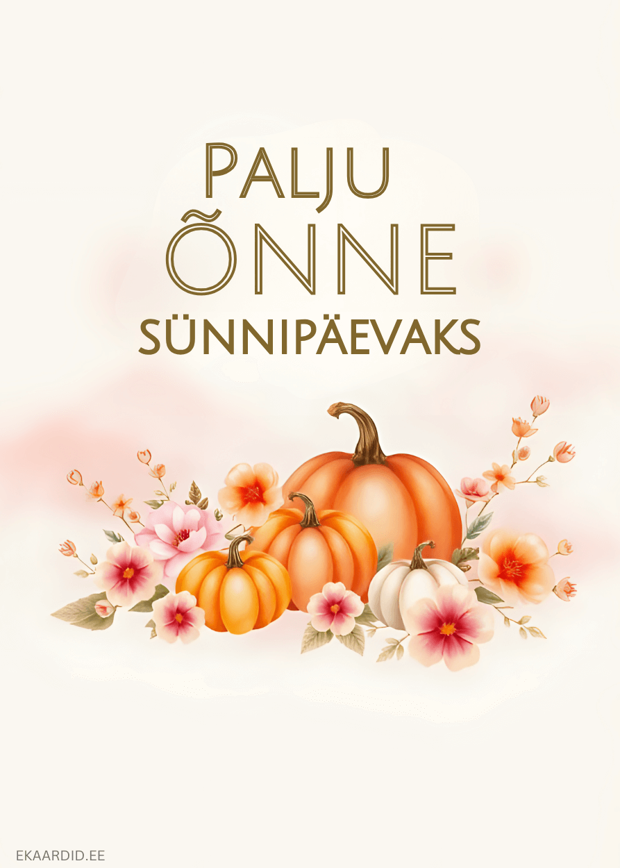 Sooja sügisese meeleoluga sünnipäevakaart, mis on kaunistatud armsate kõrvitsate ja õrnade lilledega. See on ideaalne sünnipäevakaart sügiseseks sünnipäevaks.