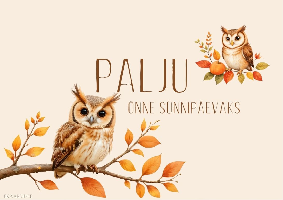 Soovi oma lähedasele palju õnne selle sügisese õhkkonnaga sünnipäevakaardiga. Kaardil on armsad öökullid ja sügislehed. See on ideaalne sünnipäevakaart sügiseste toonide ja loodusmotiivide austajatele.