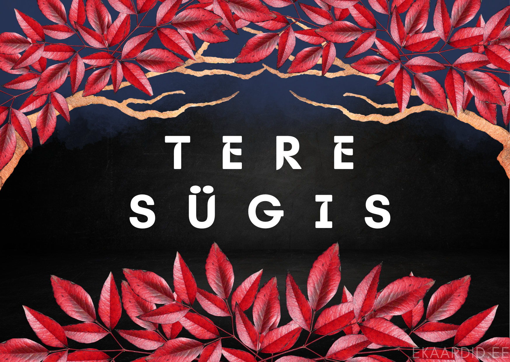 Sooja ja sügisest meeleoluga tervituskaart, mis on kaunistatud punaste lehtedega. Ideaalne sügisese tervituse saatmiseks.