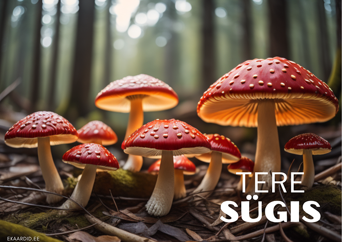 Sooja ja sügisest meeleoluga tervituskaart, mis on kaunistatud punaste puravikutega. Ideaalne sügisese tervituse saatmiseks.