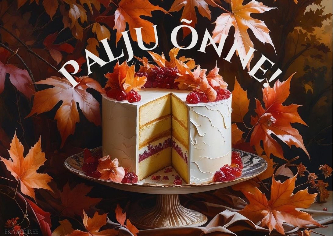 Sooja sügisese meeleoluga sünnipäevakaart, millel on kujutatud maitsev vaarikakook ja sügislehed. See on ideaalne Sünnipäevakaart lähedastele, kes hindavad hubast ja sooja atmosfääri.