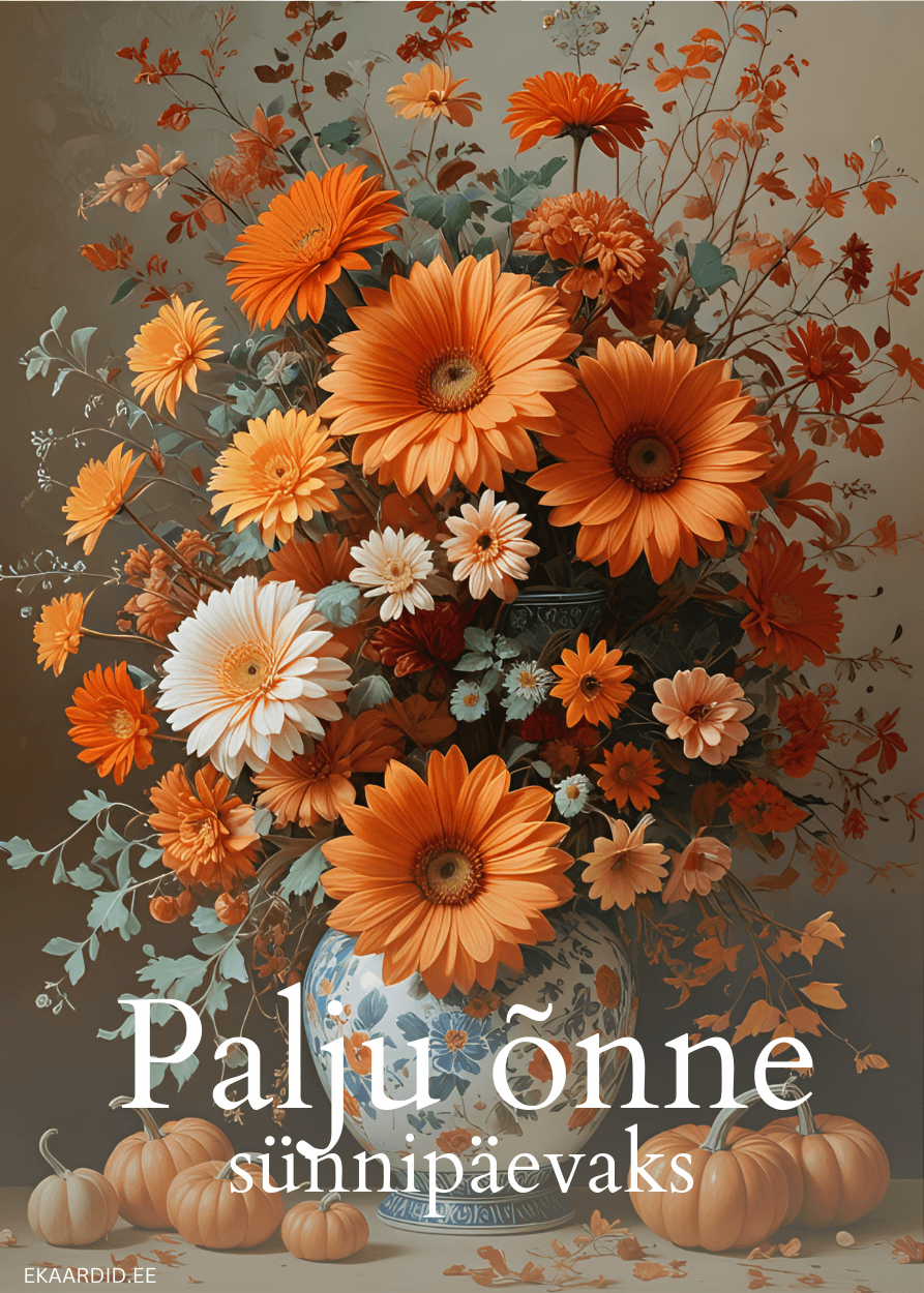 Sooja sügisvärvidega gerbera ja teiste sügislilledega kaunistatud sünnipäevakaart. See on ideaalne sünnipäevakaart lähedasele inimesele, kes hindab sügisest ilu.