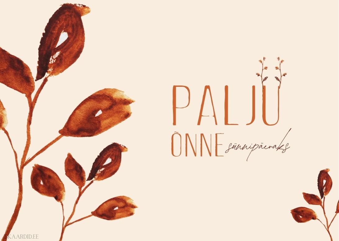 Sooja sügisvärvidega sünnipäevakaart, mis on kaunistatud pruunide lehtedega. See on ideaalne sünnipäevakaart sügiseses meeleolus.