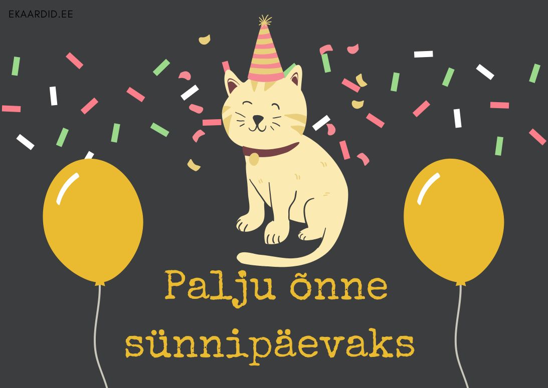 See on armas sünnipäevakaart, millel on pildil rõõmus kass pidulikus mütsikeses. Sobib ideaalselt nii tüdrukutele kui poistele, kes armastavad kasse.
