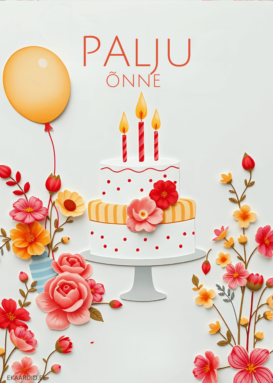 See on ideaalne sünnipäevakaart, mis on kaunistatud värviliste lillede ja piduliku koogiga. Saada see oma lähedasele ja soovi talle palju õnne!