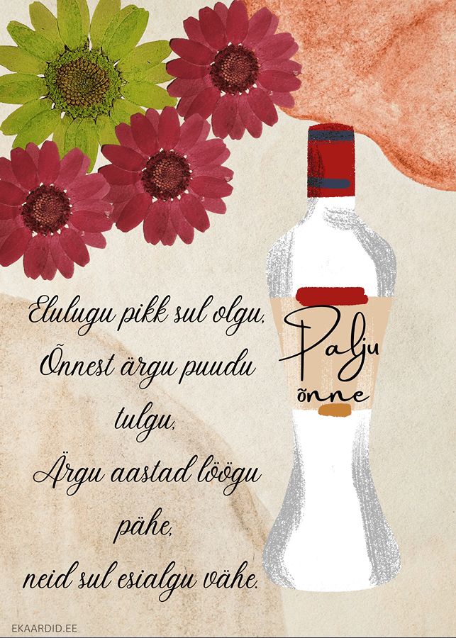 Sünnipäevakaart luuletusega ja õnnepudeliga