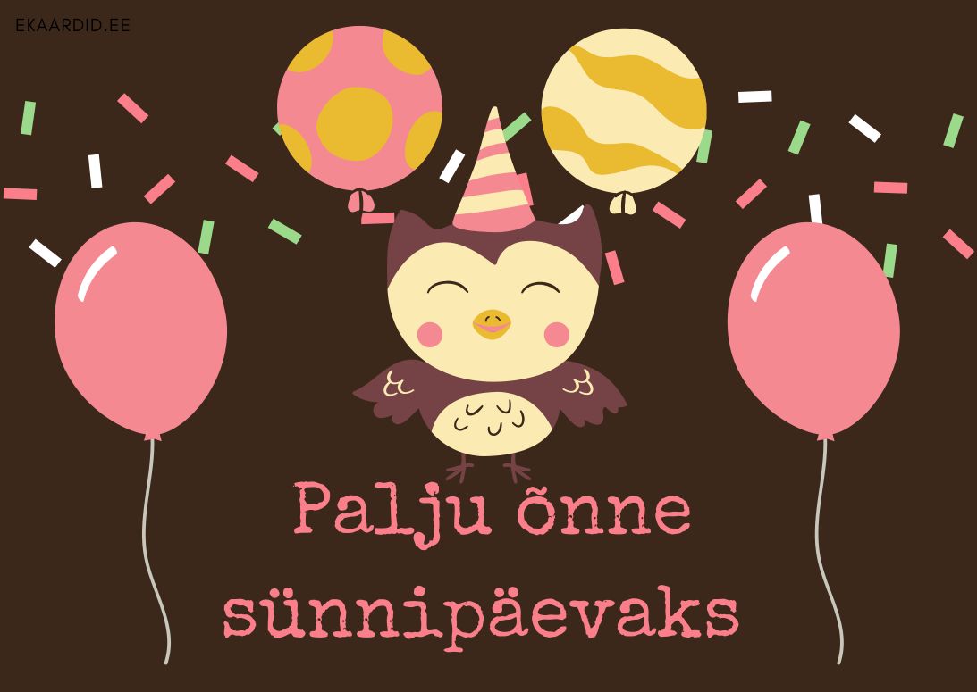 See armas sünnipäevakaart on kaunistatud õnneliku öökulliga ja värviliste õhupallidega. Ideaalne sünnipäevakaart nii tüdrukule kui ka poisile.
