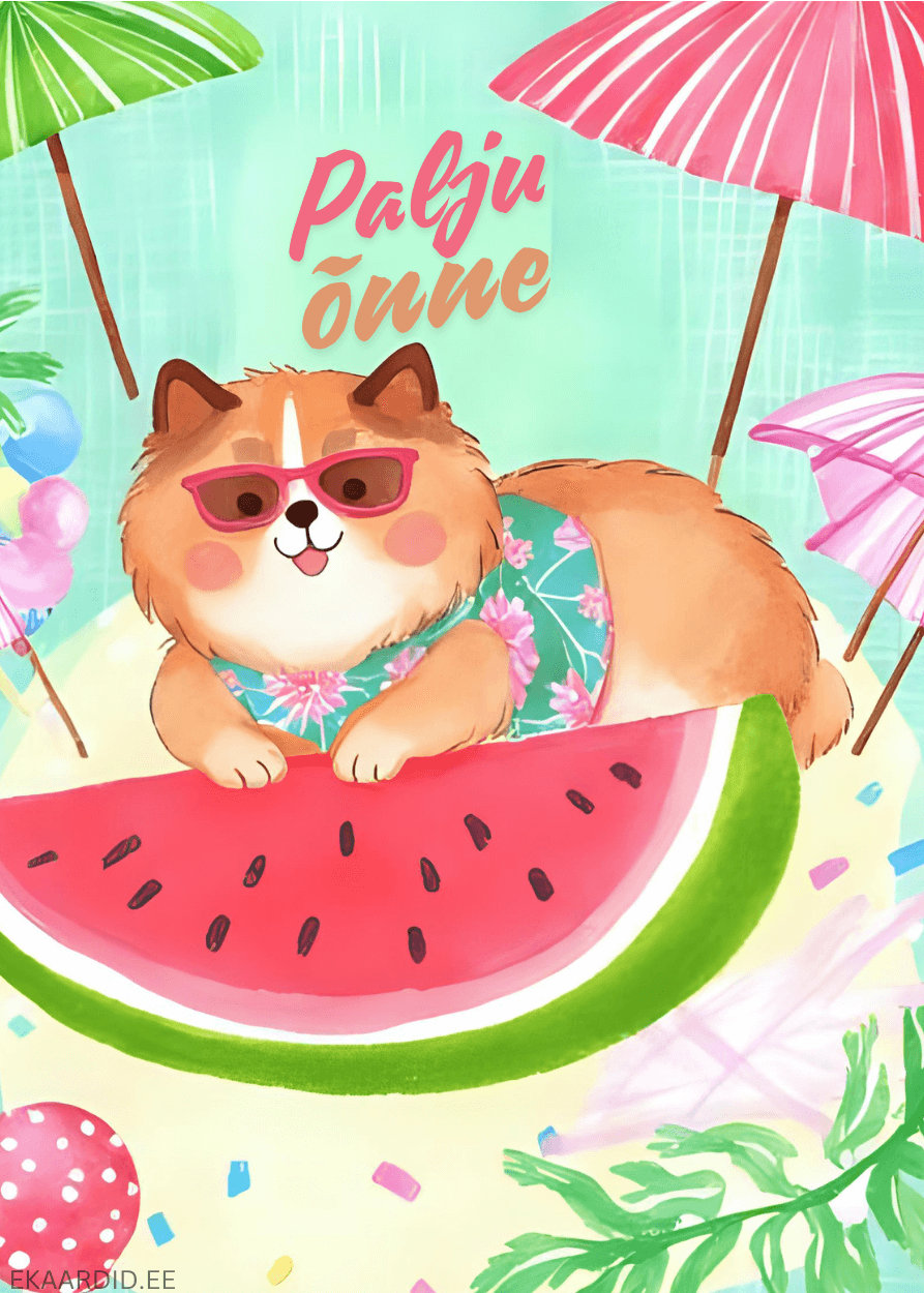 Naljakas ja armas suvine sünnipäevakaart, kus nunnu koer naudib arbuusi. Saada see rõõmsameelne sünnipäevakaart oma lähedastele!