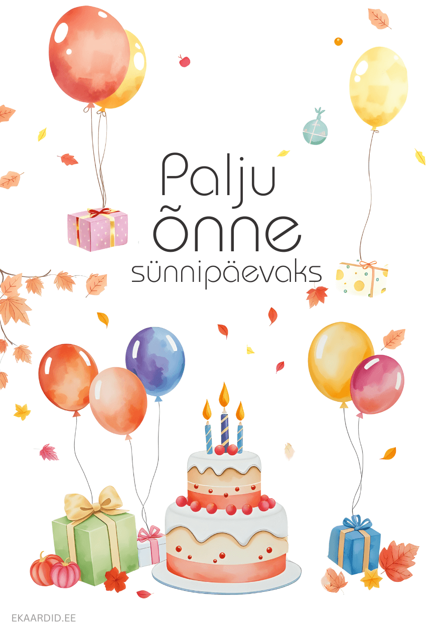 See on rõõmsameelne sünnipäevakaart, mis on kaunistatud värviliste õhupallide, kingituste ja sünnipäevatordiga. Ideaalne sünnipäevakaart lähedastele.