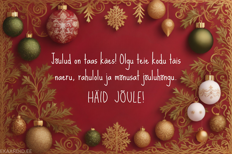 Soovi oma lähedastele rõõmsaid jõule selle kauni jõulukaardiga, mis on kaunistatud kuldsete ja roheliste jõulukuuludega. See on ideaalne jõulukaart perele ja sõpradele.