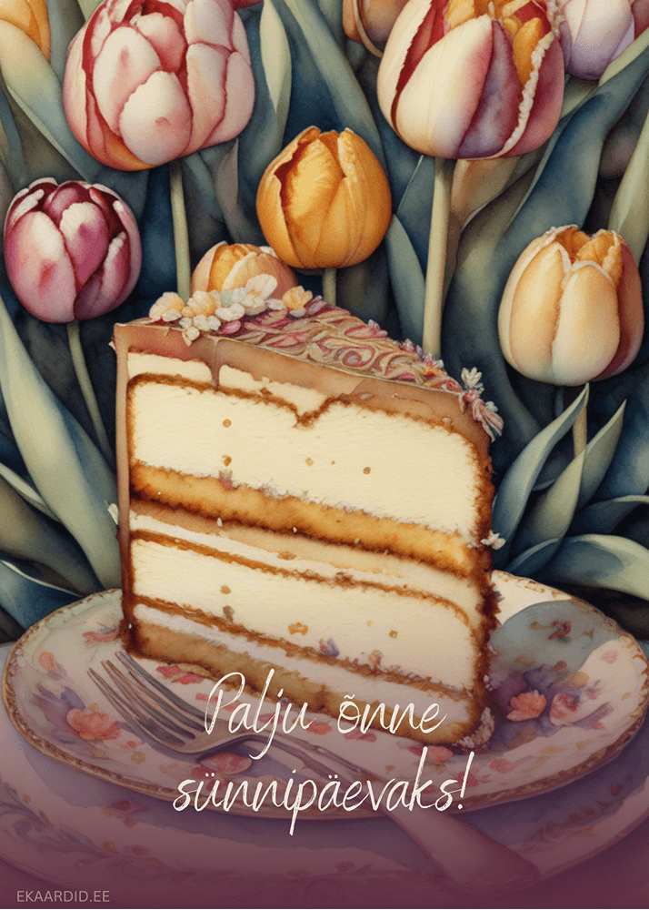 See on ideaalne Sünnipäevakaart, mis ühendab maitsva tordi ja kaunite tulbide ilu. Soovi oma lähedasele palju õnne selle elegantse ja meeldejääva kaardiga.