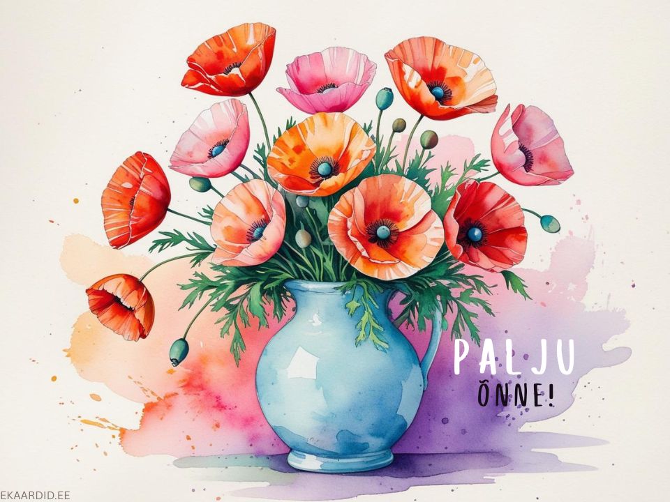 See on lummav sünnipäevakaart, mis on kaunistatud värvikirevate pojengidega sinises kannus. See on ideaalne sünnipäevakaart, mis toob rõõmu ja soojust iga saaja südamesse.