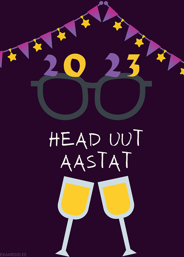 See on suurepärane kaart uue aasta tähistamiseks. Kaardil on kujutatud prillid ja šampanjaklaasid, mis sümboliseerivad pidulikku meeleolu. Soovi oma lähedastele head uut aastat selle rõõmsa kaardiga!