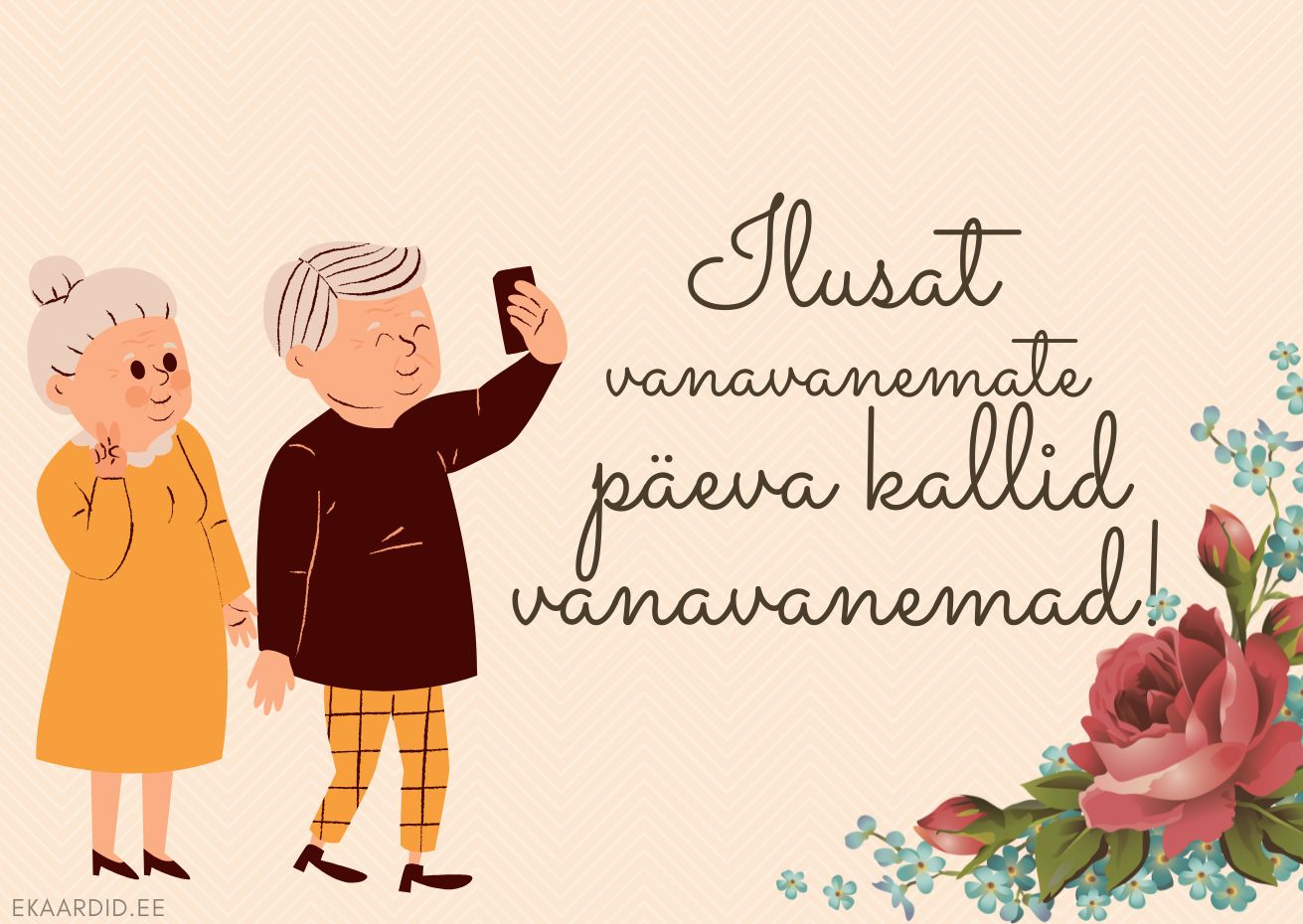 Soovi oma vanavanematele ilusat vanavanemate päeva selle armsa kaardiga. Kaardil on kujutatud vanavanemad, kes teevad selfit, ning see on kaunistatud õrnade lilledega. See on ideaalne tahtpäeva kaart, mis toob rõõmu ja soojust.
