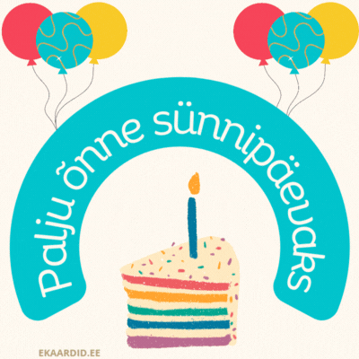 See on rõõmsameelne sünnipäevakaart, millel on kujutatud vikerkaarevärvi kihiline tort ja õhupallid. Ideaalne sünnipäevakaart lastele või noortele.